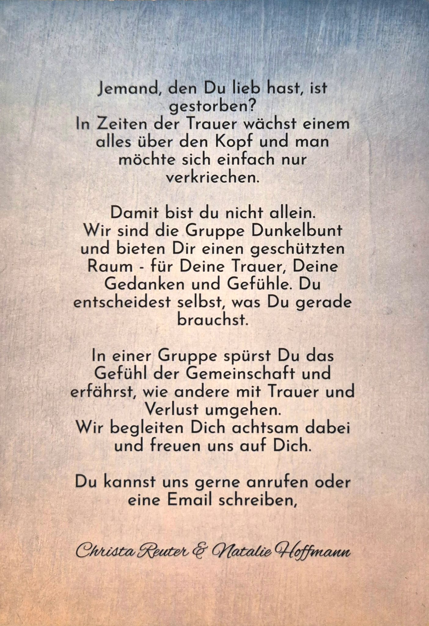 Gemeinsam mit einer Kollegin biete ich in meiner Praxis die Trauergruppe „Dunkelbunt“ an – ein geschützter, vertrauensvoller Ort für Kinder und Jugendliche, die einen nahestehenden Menschen verloren haben. Der Name steht für die vielen unterschiedlichen Gefühle, die nach einem Verlust auftreten können: Dunkle, schwere Momente gehören genauso dazu wie bunte Erinnerungen, kleine Lichtblicke oder neue Hoffnung. In unserer Gruppe darf all das Raum bekommen.